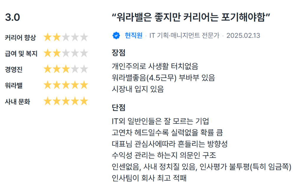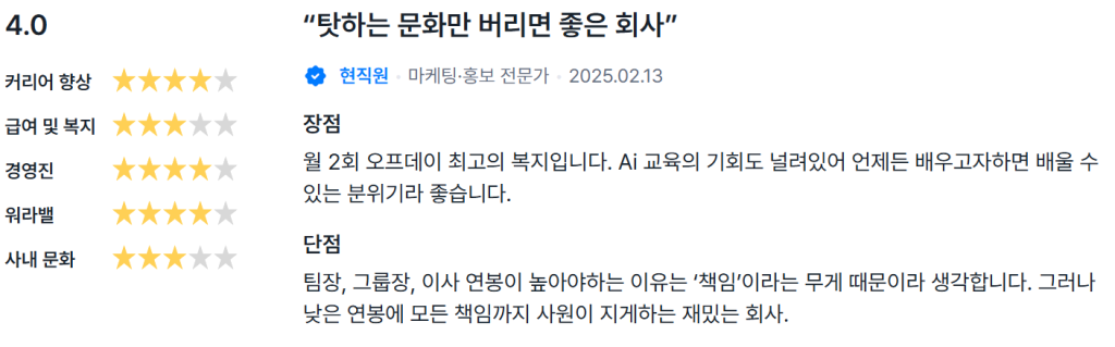 - Good work-life balance (4.5-day work system) with “Bubabu”: Enjoys a favorable work schedule and additional benefits.